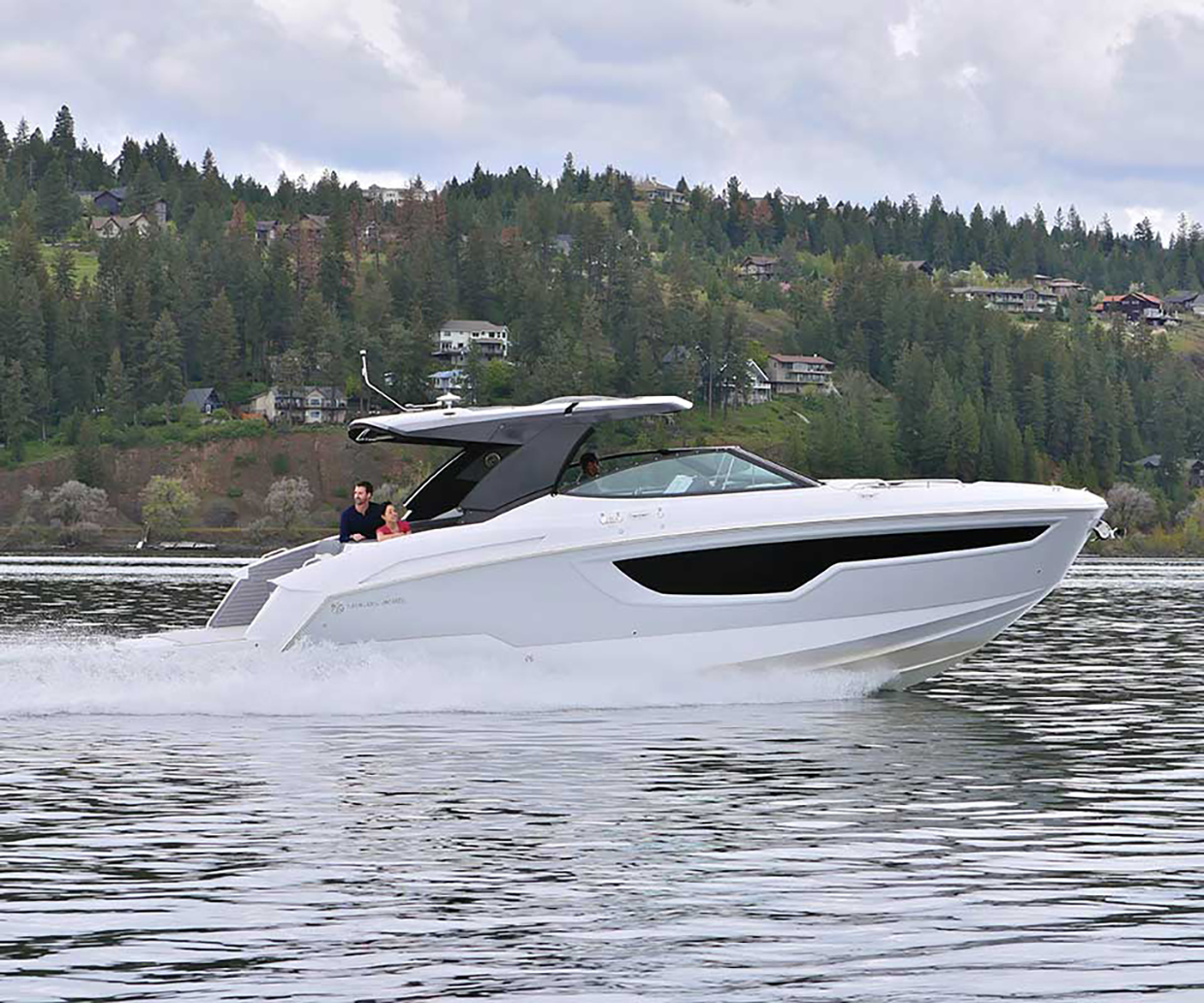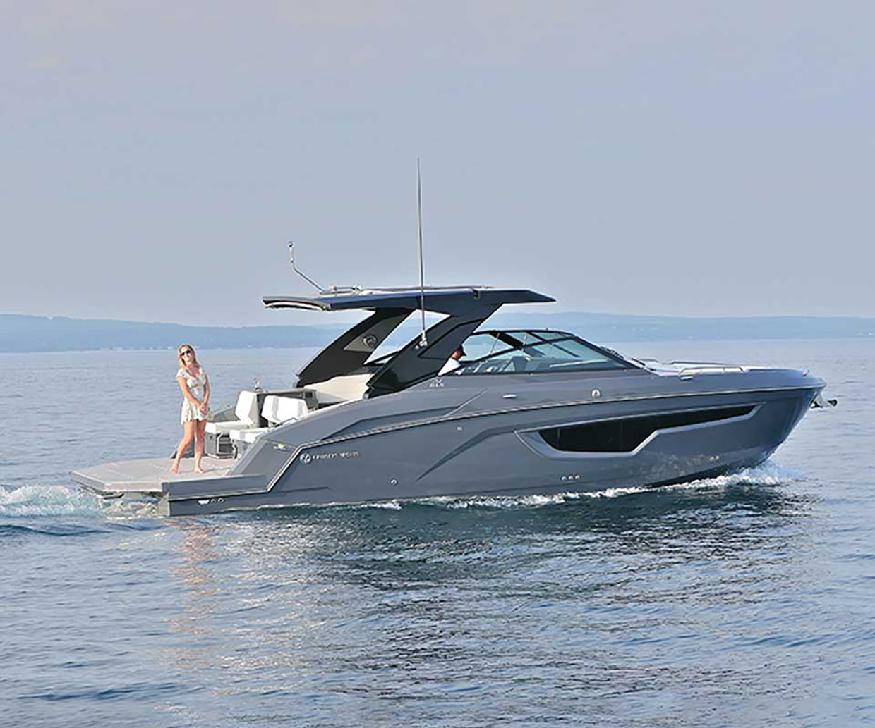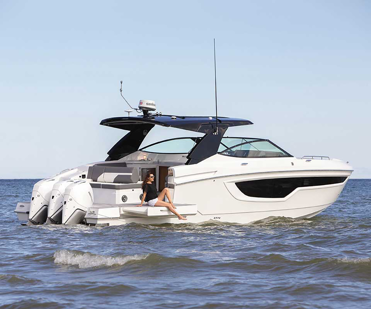 38 GLS I/O With a drop-down beach door, hydraulic swim platform, and spacious bow lounge, the 38 GLS I/O for