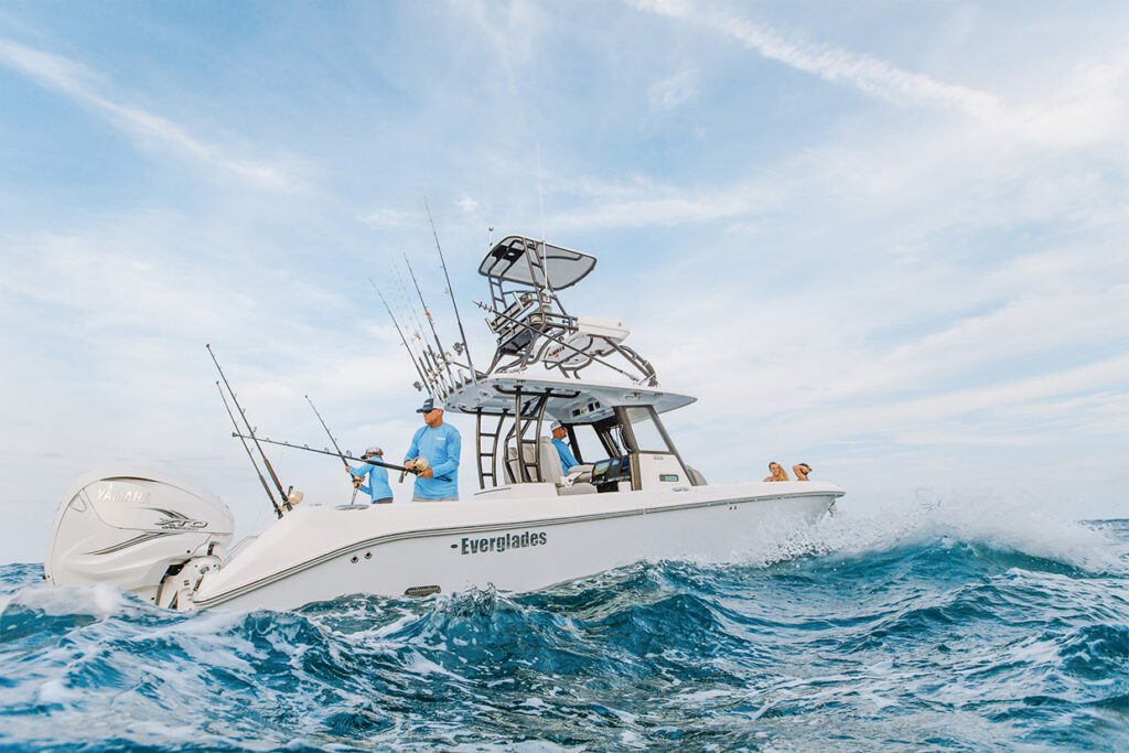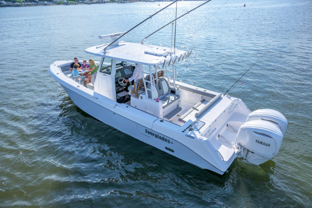 The Everglades 335CC is a top-tier 33-foot center console fishing boat that seamlessly combines advanced engineering, patented RAMCAP construction, and innovative lifestyle amenities.