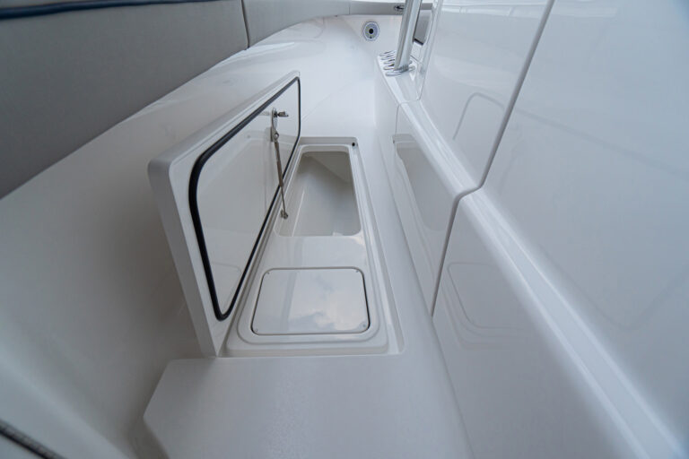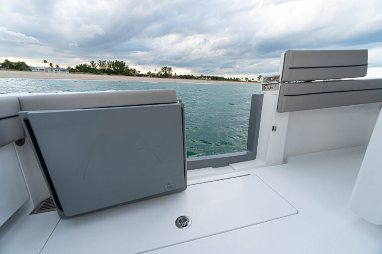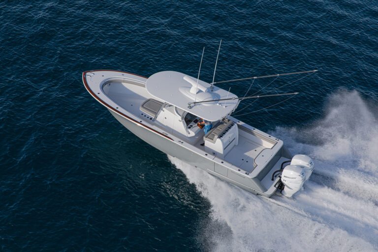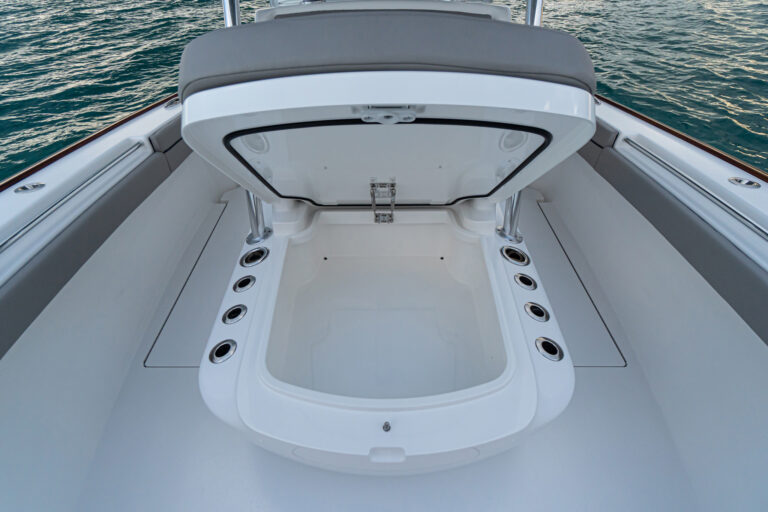 The patented Stepped-V Ventilated Tunnel delivers the softest, driest and most efficient ride of any center console in this size range. Like her larger siblings, the V-33 possesses big-boat technology. High-tech features include joystick helm control with GPS station-keeping (with any engine package), a bow thruster and gyroscope stabilization. Our design team has engineered a special under-deck compartment molded into the stringer grid for a Seakeeper SK 2. A standard port-side dive door is built with beefy, oversized hardware with meticulous fit, finish and workmanship.