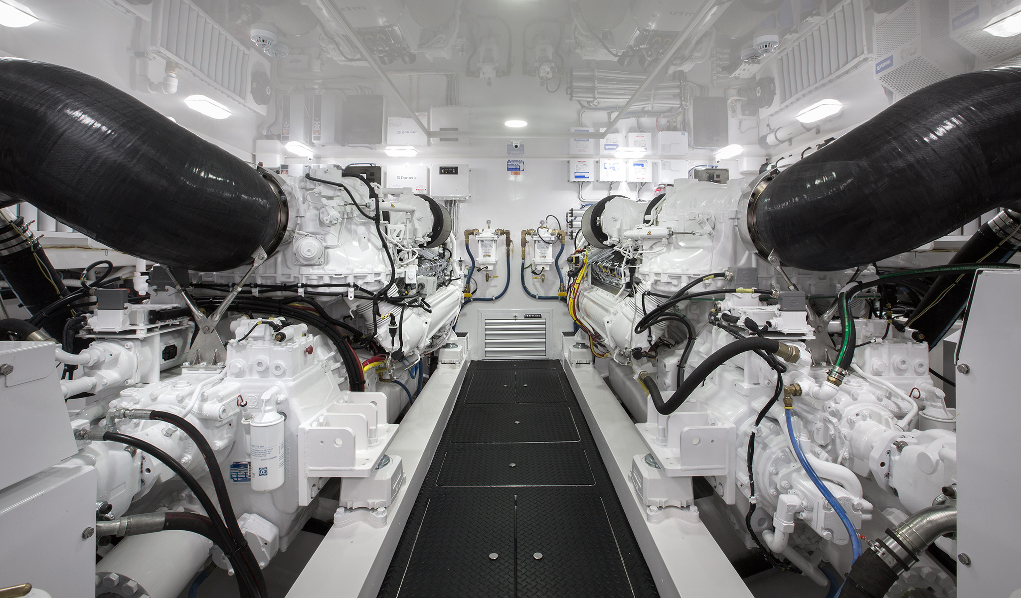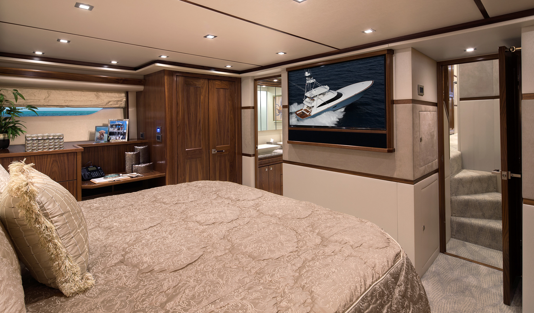 Like all Vikings, the 80 Convertible hones its blue-water DNA from its stable mates. The sleek styling showcases an impeccable sheer line with nine feet of freeboard forward tapering to slightly more than three feet at the stern, a lively reflection of the aggressive profiles of its recent brethren including the 92 and 72 Convertibles. The hull’s sharper entry merges with a higher forward chine designed to divert spray downward when ripping through head seas. Convex hull sections add curvature and form to the refined running surface, while a quad of molded running strakes accentuate lateral tracking and maneuverability. Tumblehome at the corners of the curved transom adds definition and beauty. Deadrise at the transom is 12.5 degrees and the beam is carried well aft providing exceptional volume, buoyancy and balance.